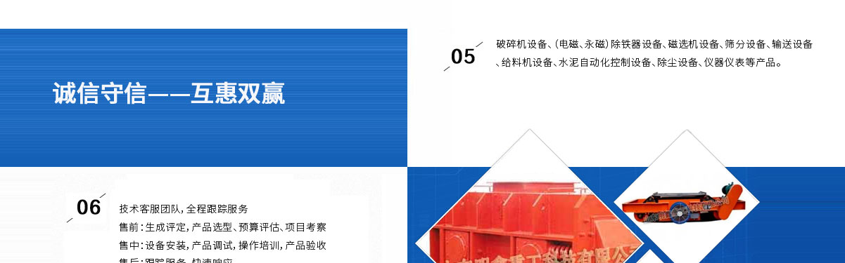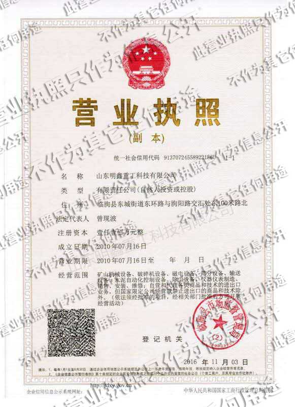 | 山東明鑫重工科技有限公司為是集科研開(kāi)發(fā),設(shè)計(jì)制造、銷(xiāo)售、安裝、調(diào)試為一體的技術(shù)制造企業(yè)。公司位于美麗的****風(fēng)箏都-濰坊市(國(guó)家AAAA級(jí)森林公園-沂山景區(qū)駐地)臨朐東城工業(yè)園。本公司產(chǎn)品種類(lèi)有:破碎機(jī)設(shè)備,(電磁、永磁)除鐵器設(shè)備,磁選機(jī)設(shè)備,篩分設(shè)備,輸送設(shè)備,給料機(jī)設(shè)備,水泥自動(dòng)化控制設(shè)備、除塵設(shè)備,儀器儀表等產(chǎn)品。其產(chǎn)品有五十多個(gè)系列,四百多種規(guī)格,并可根據(jù)客戶需求設(shè)計(jì)生產(chǎn)相應(yīng)的產(chǎn)品。其產(chǎn)品廣泛應(yīng)用于冶金、電力、煤炭、礦山、造紙、食品、化工建材、耐火材料、磚瓦、水泥、玻璃等行業(yè),產(chǎn)品暢銷(xiāo)國(guó)內(nèi)三十多個(gè)省市、自治區(qū)。 |